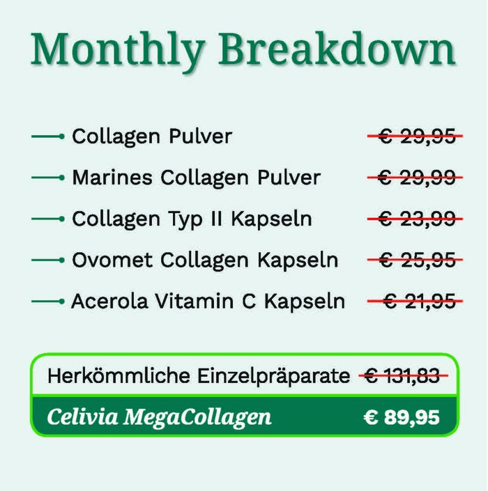 Schluss mit vielen Dosen, Kapseln und Pulvern – MegaCollagen vereint alles in einer einzigartigen Formel. Dabei sparst du nicht nur Zeit und Aufwand, sondern auch bares Geld: Anstatt 131,83 € für einzelne Produkte zahlst du nur 89,95 € für unser Celiva MegaCollagen Complex.