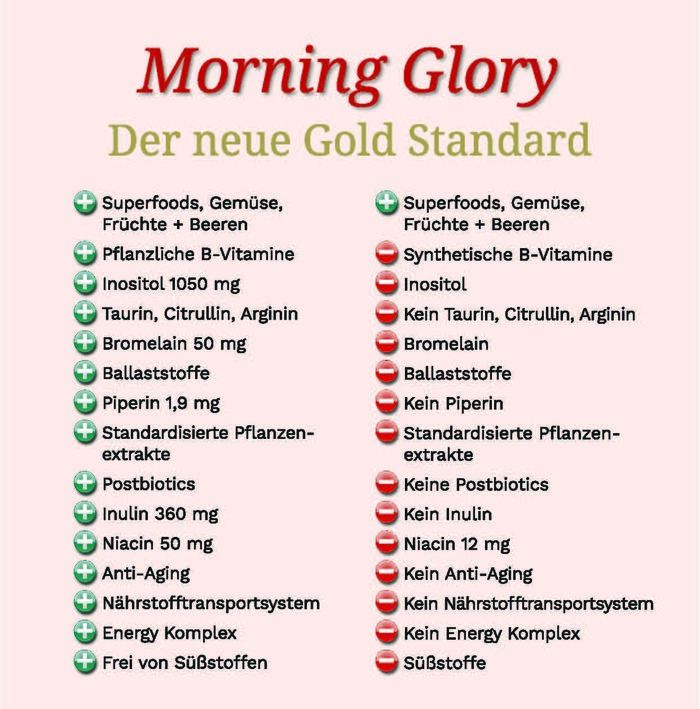 Während andere Produkte mit synthetischen Vitaminen, minderwertigen Dosierungen und Süßstoffen arbeiten, kombiniert Morning Glory die Kraft der Natur mit modernster Nährstofftechnologie – für mehr Energie, Fokus und Vitalität.