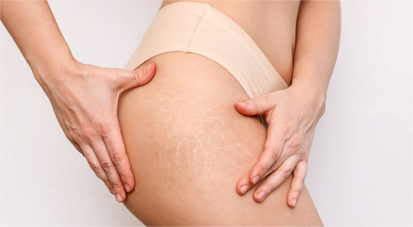 Stretch marks occur when the connective tissue is weakened and overstretched. The fibers of the subcutis (collagen and elastin) tear and the scar-like stretch marks form.